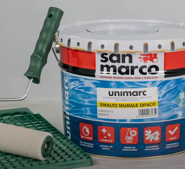 UNIMARC SMALTO MURALE OPACO - Oferă acoperire excelentă, luminozitate, transpirabilitate și rezistență optimă la spălare și dezinfectare. Uscare rapidă, reducând timpul de aplicare a straturilor ulterioare.